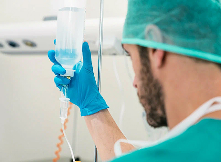 Поставят капельницу, используя одноразовую инфузионную систему. Игла вводится в кровеносный сосуд в месте локтевого сгиба. Врач устанавливает скорость введения раствора, контролирует его.